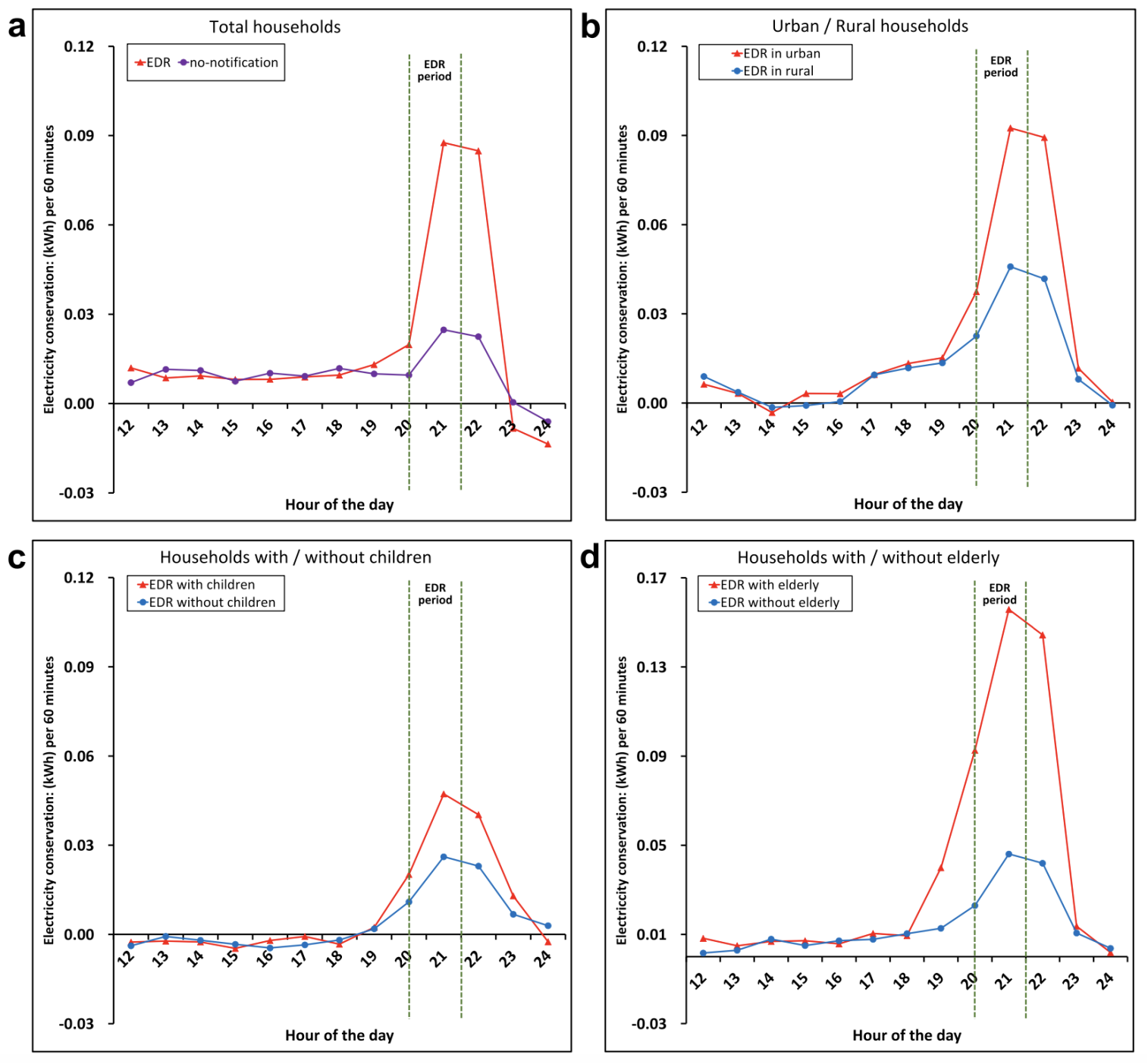 圖1:基于激勵的EDR措施對異質群體高峰時期用電的影響。(a-d. 描述了不同群體中EDR組和無通知組的電力節約量。縱坐標表示基準日和處理日之間的用電量(以千瓦時為單位)的差異。a.整體效果; b.城市和農村家庭;c.有兒童的家庭;d.有老人家庭)