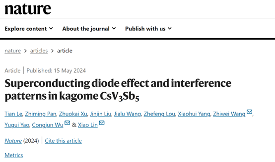編輯:王莉蓉 審核:陳珂 閱讀次數:2024年5月15日,北京理工大學物理學院王秩偉教授、姚裕貴教授團隊,與西湖大學林效教授、吳從軍教授團隊等人合作,在《自然》雜志上在線發表題為“Superconducting diode effect and interference patterns in kagome CsV3Sb5”的研究論文。首次在籠目晶格超導材料CsV3Sb5中觀察到了零磁場超導二極管效應和超導干涉條紋,在一定程度上證明了CsV3Sb5中超導態具有時間反演對稱性破缺的特征。