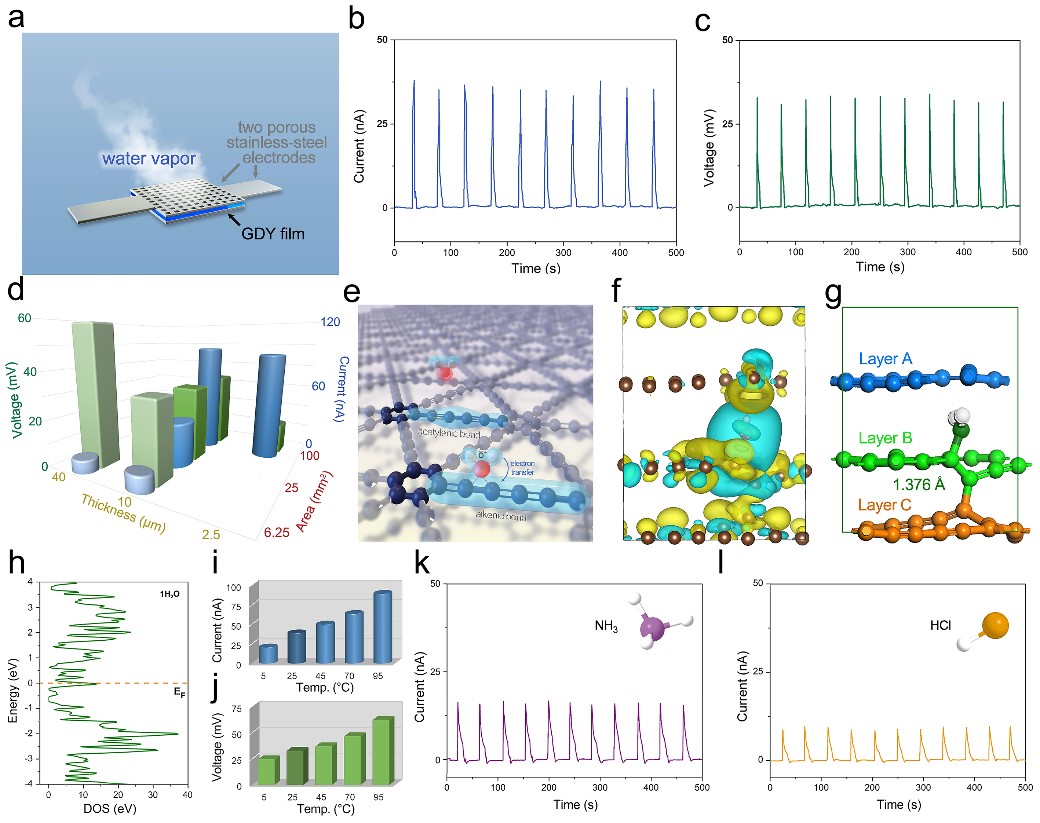 圖2. (a-d) GDY薄膜發電裝置的核心結構、產生規律的脈沖電信號的情況及影響因素。(e-h) GDY結構片段與H2O分子配位引起的電子轉移和炔烴轉化的機制示意圖及相關理論計算。(i-l) 溫度和分子種類對產電信號的影響。