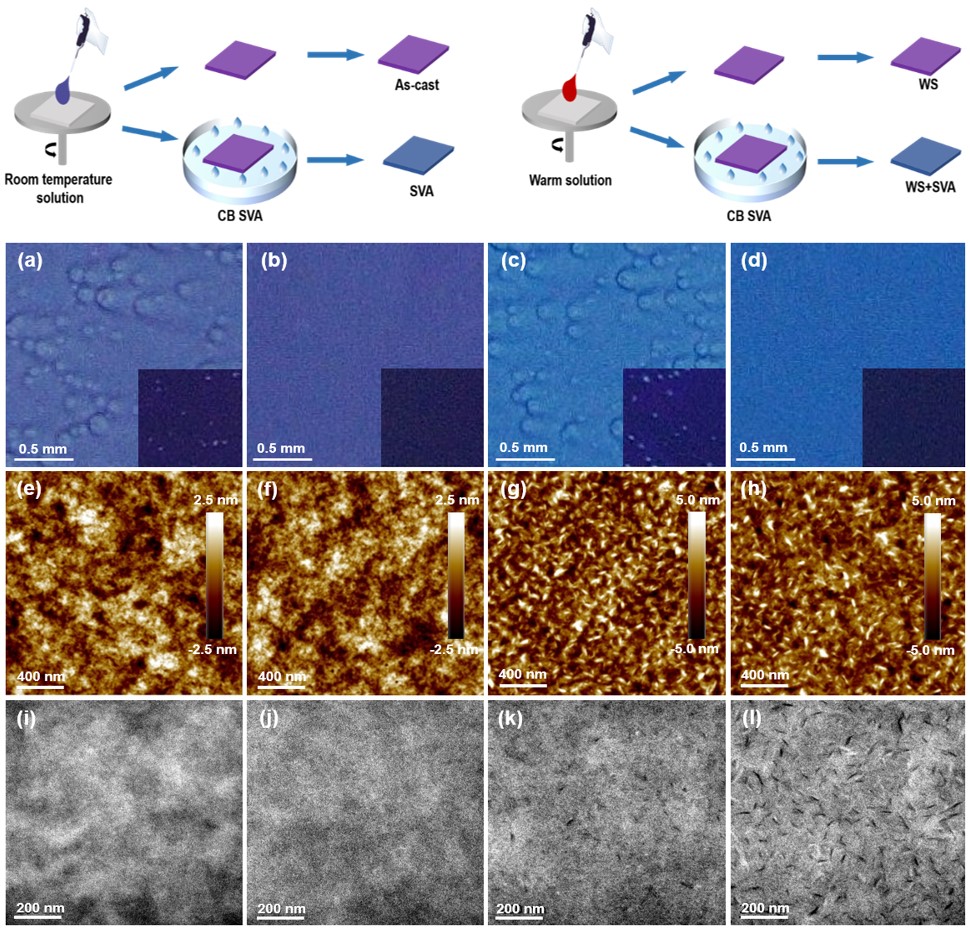 在本項研究中,研究者采用了熱溶液(warm solution, WS)和溶劑熏蒸退火(solvent-vapor annealing,SVA)雙管齊下的策略來調控小分子有源層的形貌。其中WS不僅能夠提升給受體材料(B1和BTP-eC9)的溶解度,而且在成膜過程中能夠加速溶劑揮發,減少成膜時間,使有源層中分子分布更加均勻,形成光滑無孔的混合薄膜;SVA可調控成膜后的分子動力學,延長分子自組裝時間。通過控制SVA時間可優化有源層中的相分離和分子排布。通過WS+SVA的協同作用,有源層形貌得到較大改善,提升了器件的光子俘獲、激子解離、載流子傳輸和收集,從而使其獲得15.68%的效率,這是當時二元小分子OSCs的最高效率值。