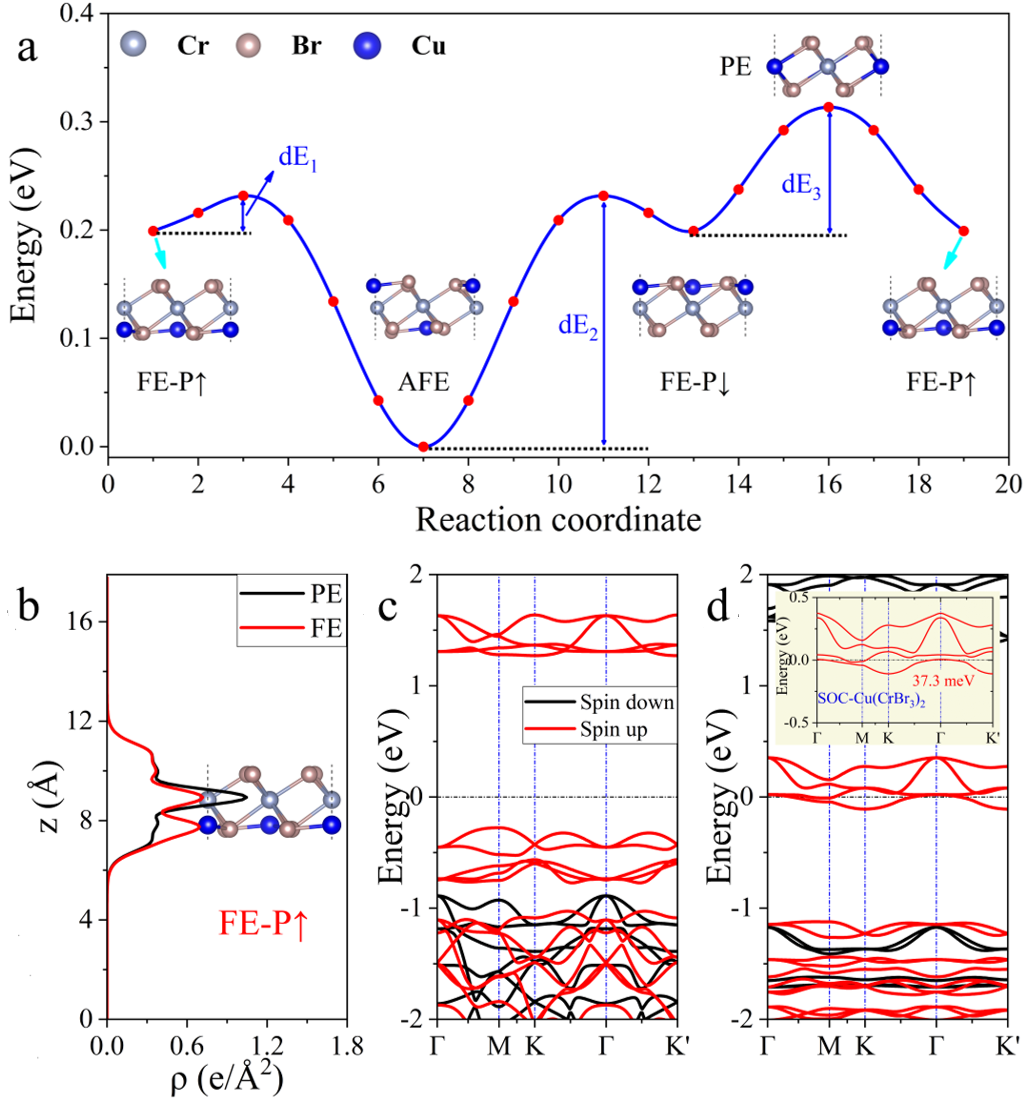 長期以來,人們一直在尋找具有本征多鐵性的二維材料,以實現納米電子器件中磁電耦合的應用。本工作中作者利用過渡金屬原子修飾單層三鹵化鉻實現了單層穩定的Ⅰ型多鐵性,并且其電極化為面外鐵電極化,這有利于外場對其鐵電性的調控。面外鐵電極化表現出較強的原子選擇性,作者發現了84種基于過渡金屬的單層多鐵材料,其中有12種具有面外鐵電或反鐵電極化。通過群論分析揭示了這種現象依賴于p-d耦合和晶體場劈裂。Cu修飾增強了三鹵化物的本征鐵磁性,并且提高了鐵磁轉變溫度。通過計算不同鐵電結構(反鐵電和鐵電)的電極化,作者研究了該系統中的磁電耦合效應。在這些體系中作者獲得了鐵電相和反鐵電相,為磁性材料的外場調控、能量存儲和轉換應用提供了新機遇。此外,作者利用非平衡格林函數方法,計算了雙電極Cu(CrBr3)2器件的輸運性質,結果表明,Cu(CrBr3)2器件具有出色的自旋過濾特性和低偏壓負微分電阻(Negative differential resistance, NDR)效應,具有低功耗的開關響應特性。作者的研究不僅深化了對二維多鐵性材料的認識,預測了多種具有面外鐵電極化的新材料,并揭示了其鐵電性和鐵磁性增強機制,在納米電子和自旋電子器件領域具有廣闊的應用前景。