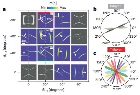 通過構建多層轉角結構普適的理論模型,研究人員發現三層轉角氧化鉬晶體中極化激元無衍射傳播方向強烈依賴于轉角。如圖2所示,當轉角(θ1-2為第一層和第二層氧化鉬晶體之間的轉角,θ1-3為第一層和第三層氧化鉬晶體之間的轉角)發生改變時等頻線法線方向也在發生變化(例如θ1-2 ="30°," θ1-3 =""-40°時法線與豎直方向夾角為φc=50°,而θ1-2 =30°, θ1-3 =""-60°時φc=80°),即可以通過改變三層氧化鉬晶體轉角實現納米紅外光場低損耗、無衍射傳播的面內全角度調控。可以看到,在雙層轉角氧化鉬晶體中通過改變材料層厚、入射光頻率等多個參數僅能在0-30°的范圍內實現納米光場無衍射傳播方向的調控。然而,三層轉角氧化鉬晶體中通過改變轉角(相同的三層氧化鉬晶體,不改變材料層厚)可以實現納米紅外光場無衍射傳播方向的面內全角度(0-360°)調控。
