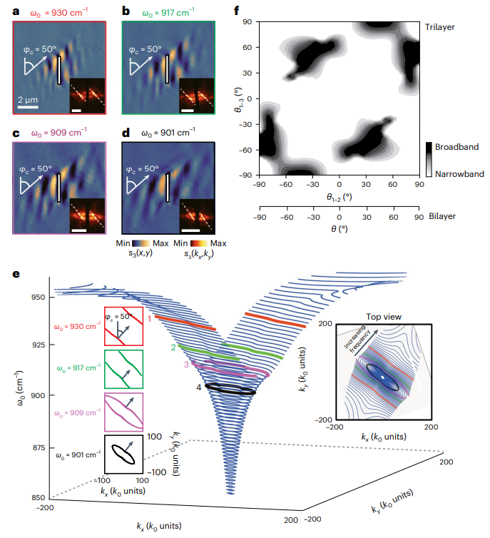 除此之外,理論研究還表明,三層轉角氧化鉬晶體中極化激元等頻線可以在很寬的頻率范圍(870 cm-1-940 cm-1)內表現為平行直線(無衍射傳播)。如圖4所示,研究人員采用s-SNOM獲得了不同入射光頻率下三層轉角氧化鉬晶體的近場光學圖像。當入射光頻率從901 cm-1變化至930 cm-1時,近場光學圖像與理論預言一致:金納米天線激發的極化激元表現為沿著φc=""50°的方向高度定向傳播(無衍射損耗)。這說明在三層轉角氧化鉬晶體中光學魔角具有光譜魯棒性,可以在寬光譜范圍內實現紅外納米光場的高度定向傳播。