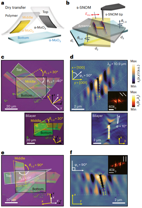 為了解決這一問題,研究人員在三層轉角氧化鉬晶體中發現多重光學魔角,通過轉角重構實現了納米光場無衍射傳播方向的面內全角度調控(0-360°),且覆蓋寬光譜頻率。如圖1所示,通過自主搭建的微操控平臺可以精確控制三層轉角氧化鉬晶體中的轉角度數,而通過微區拾取技術可以將制備的三層氧化鉬結構進行拆分,重復上述過程可以實現轉角的多次重構。基于紅外納米成像技術,研究同一個樣品中轉角對紅外納米光場無衍射傳播的調制作用。實驗發現當轉角改變時,紅外納米光場的傳播方向由φc°="50°變為φc°=90°。
