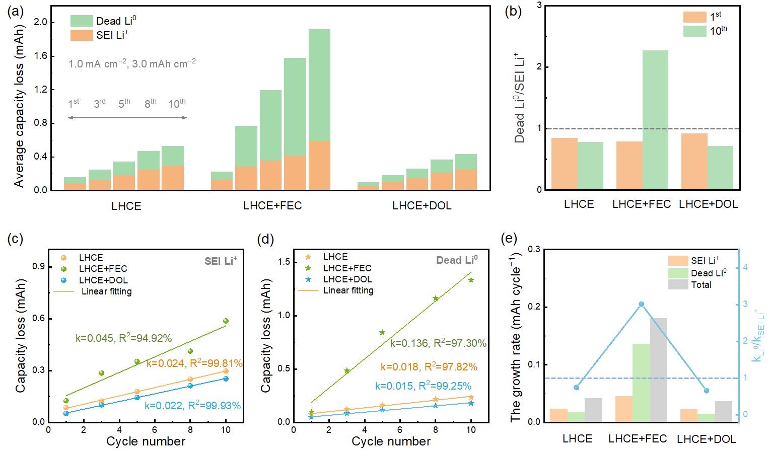 圖1 定量區(qū)分不同電解質(zhì)中來源于SEI Li+/dead Li0的容量損失