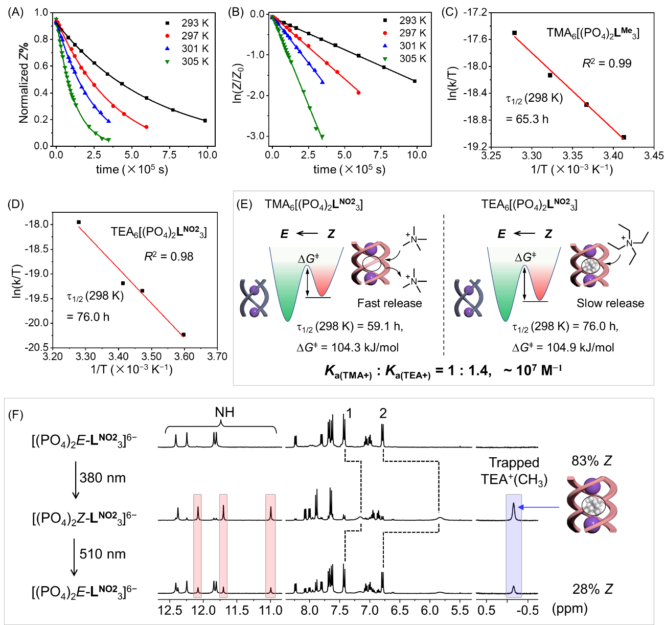 通過1H NMR系統研究了三螺旋結構在不同溫度下的Z→E熱弛豫行為,利用一級反應動力學方程進行了數據分析,如圖2所示。結果表明:當抗衡陽離子為四甲基銨根(TMA+)時,三股螺旋體的熱弛豫速率明顯減慢約17倍;當抗衡陽離子為四乙基銨根(TEA+)時,三股螺旋體的熱弛豫速率明顯減慢約20倍。主要原因是三股螺旋體的順式異構體能夠形成一個中心空腔,通過靜電作用和陽離子-π作用結合銨根離子(106 ~ 107 M?1),TEA+陽離子的結合強度是TMA+結合強度的1.4倍。