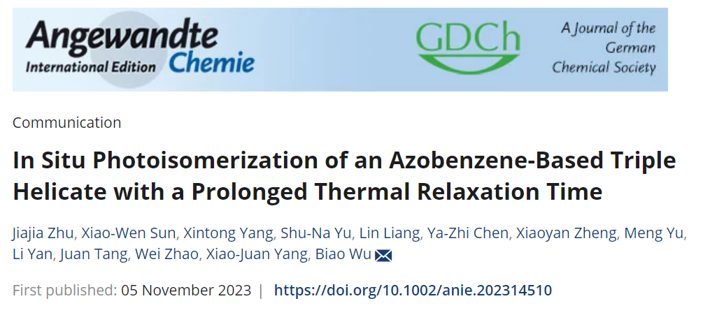 編輯:田柳 審核:王振華 閱讀次數:近日,北京理工大學化學與化工學院吳彪教授和趙偉特別研究員在國際知名化學期刊《 Angewandte Chemie International Edition 》上發表題目為“In Situ Photoisomerization of an Azobenzene-Based Triple Helicate with a Prolonged Thermal Relaxation Time”的研究論文。該工作實驗部分主要由北京理工大學研究生朱甲佳和孫小文完成,理論計算部分由研究生楊心彤在鄭小燕長聘副教授的指導下完成。此項研究得到了國家自然科學基金,北京市自然科學基金和北京理工大學青年教師學術啟動計劃等項目的資助及北京理工大學分析測試中心的支持。