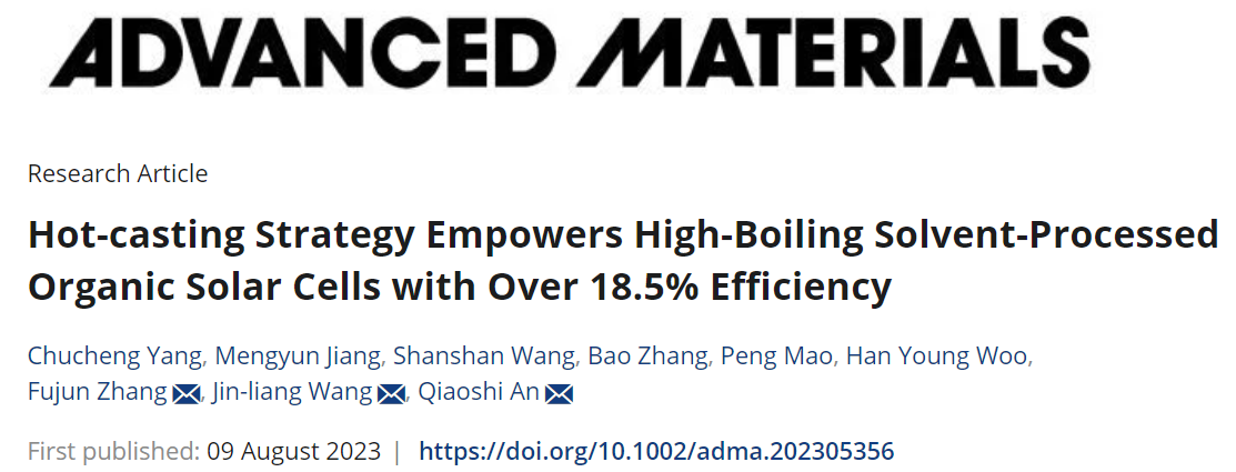 編輯:田柳 審核:王振華 閱讀次數:近期,北京理工大學化學與化工學院本科生楊楚宬和博士生蔣夢云以共同一作身份在國際頂級期刊《 Advanced Materials 》(IF: 29.4)上發表題目為“Hot-casting strategy empowers high-boiling solvent-processed organic solar cells with over 18.5% efficiency”的研究論文。北京理工大學為第一通訊單位,安橋石特別研究員、王金亮教授和北京交通大學張??〗淌跒楣餐ㄓ嵶髡?。本研究得到了國家自然科學基金,北京市自然科學基金和北京理工大學青年教師學術啟動計劃等項目的資助及北京理工大學分析測試中心的支持。