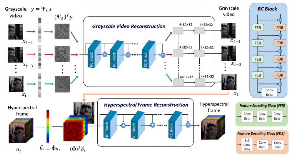 如圖3,深度學習重建方法由兩個階段組成。先基于長短期記憶(LSTM)網絡的模型利用5個相鄰幀之間的時間相關性,從“結構化隨機”編碼測量中重建灰度視頻。再基于殘差連接的卷積神經網絡(CNN)的高光譜重建網絡,從深度空間-光譜聯合壓縮測量值及第一階段的灰度視頻中恢復高光譜幀。