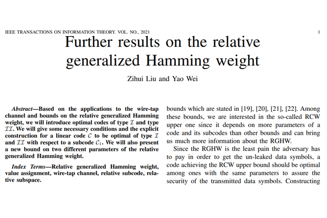 日前,北京理工大學(xué)數(shù)學(xué)與統(tǒng)計(jì)學(xué)院劉子輝副教授和其研究生魏瑤在碼的相對(duì)廣...
