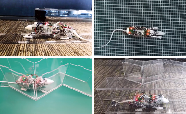 該項目提出了雙平行四桿和高靈活連桿驅(qū)動的傳動方法,實現(xiàn)了仿生腿足結(jié)構(gòu)的精巧設(shè)計和柔性腰部結(jié)構(gòu)的優(yōu)化設(shè)計,為狹窄空間內(nèi)探測提供了重要基礎(chǔ);同時提出了基于PSO的CPG優(yōu)化網(wǎng)絡(luò)步態(tài)調(diào)整方法,實現(xiàn)了行走、小跑、跳躍等多種步態(tài)及其轉(zhuǎn)換,為靈巧運動的實現(xiàn)提供支撐;基于以上方法研制的本機器鼠可實現(xiàn)屈膝到站立、直行、扭轉(zhuǎn)、匍匐前進等多種模態(tài)。