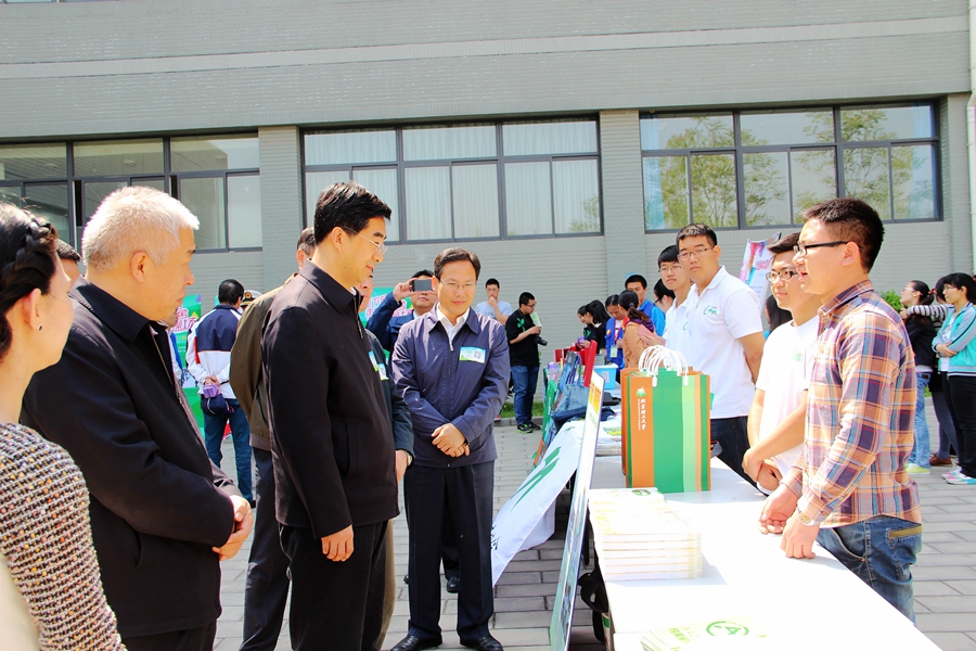 隨后,秦宜智來到我校生命學(xué)院生態(tài)科考團(tuán)展臺前,同學(xué)們熱情地向秦書記介紹了通過參與生態(tài)科考、將科考成果和親歷感悟編撰而成的《親歷科考 感悟生命》、《校園植物志》和《大自然的守望者》3冊圖書,以及自己的收獲。接著,秦宜智來到我校綠萌資源與環(huán)境保護(hù)協(xié)會展臺前,一邊傾聽同學(xué)們介紹開展的春季植樹、再生紙緣、變廢為寶、環(huán)教進(jìn)小學(xué)等環(huán)保活動,一邊翻看社團(tuán)環(huán)保活動的“小成果”(環(huán)保袋、樹葉書簽、卡貼等),與同學(xué)們親切地交流,秦宜智對我校兩個環(huán)保社團(tuán)開展的活動表示了充分的肯定,希望同學(xué)們在繼續(xù)開展好生態(tài)科考、春季植樹等活動的基礎(chǔ)上,將環(huán)保理念向周圍的廣大同學(xué)、社區(qū)居民和小學(xué)生等群體傳遞,通過大家的努力提高全社會的環(huán)保意識。