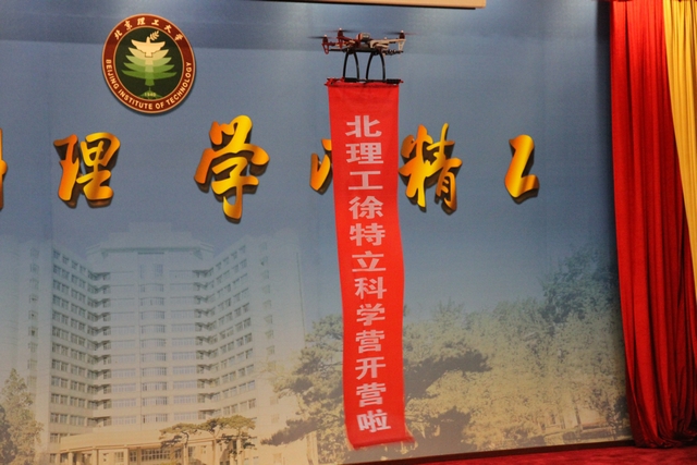 在熱烈的掌聲中,王越院士宣布北京理工大學(xué)徐特立科學(xué)營正式開營。于此同時,北京理工大學(xué)宇航學(xué)院航模隊設(shè)計制作的四軸飛行器,攜著“北京理工大學(xué)徐特立科學(xué)營開營啦”字樣的條幅盤旋在主席臺的上方,為科學(xué)營助力,為營員們喝彩,攜帶著全體營員們的科技夢想自由飛翔。