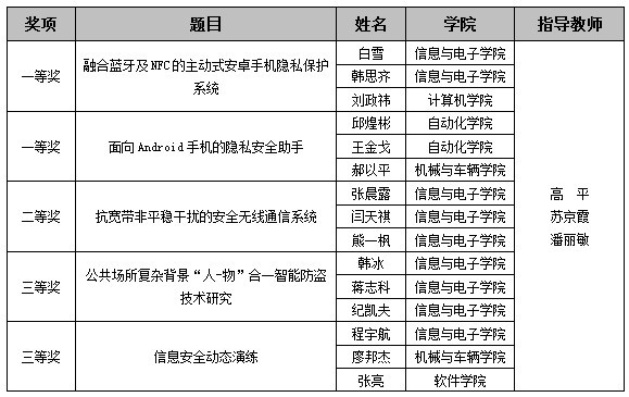 在教務處的統(tǒng)籌安排和信息與電子學院高平、蘇京霞、潘麗敏3位教師的具體指導下,經(jīng)過五個多月的艱苦集訓與不懈努力,信息與電子學院白雪、韓思齊,自動化學院邱煌彬、王金戈,計算機學院劉政祎,機械與車輛學院郝以平6名學生獲得全國一等獎,信息與電子學院張晨露、閆天祺、熊一楓3名學生獲得全國二等獎,信息與電子學院韓冰、蔣志科、紀凱夫、程宇航,機械與車輛學院廖邦杰,軟件學院張亮6名學生獲得全國三等獎。本次全國大學生電子設計競賽信息安全技術(shù)專題邀請賽的獲獎,是我校今年在全國性大學生科技競賽中取得的又一驕人成績。
