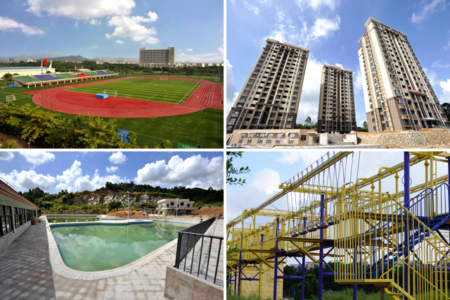 田徑場翻新,為北理增添一份美景;二期教師安居工程竣工交付,共建教師公寓400套;新建游泳池;新建學生素質拓展基地,圖片展示的高空自保項目為國內首套該類型設備。