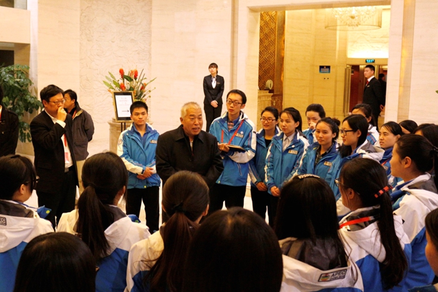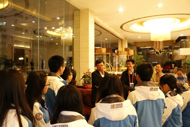 隨后,李和章副校長一行到亞奧國際酒店慰問機場交通組的我校志愿者。李校長親切地詢問了志愿者的工作安排與工作情況,并勉勵同學:“現(xiàn)在中國逐漸承辦越來越多的國際型活動,承擔越來越多的國際責任,發(fā)揮更大的影響力。對于大家來說,這次的APEC是一個機會,是一個展示中國形象、展示北京大學生風貌的機會,同學們要好好珍惜,好好加油。”在對大家工作給予高度贊揚與肯定的基礎上,希望大家在接下來的一段時間內(nèi)認真工作,合理休息,并注意自身安全。