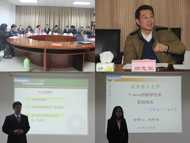 2014年11月20日下午,北京理工大學2013-2014學年T-more創(chuàng)新學生獎入圍學生答辯會在研究生樓112會議室舉行,出席此次答辯會的嘉賓有北京理工大學T-more研究中心主任顏志軍教授,以及校友會、紀委、教育基金會、教務處、研究生院、學生工作處的負責人。答辯會由學生工作處副處長許欣主持。