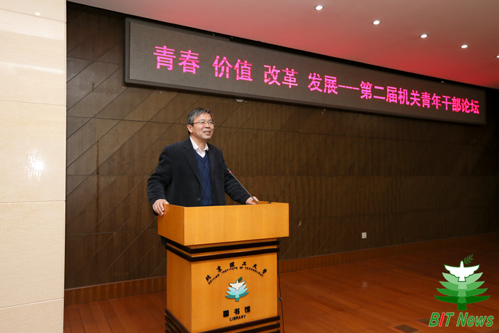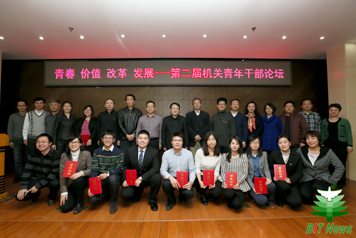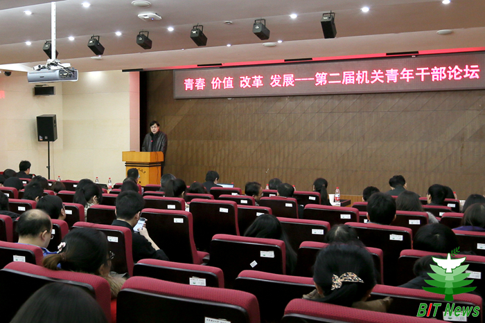 9位機關青年在本屆論壇上發言。宣傳部和霄雯以《透韌如竹 “笨”向未來》為題,從一個親身經歷的職場故事入手,講述了如何以竹子般的透韌之勁扎實工作,奉獻青春;國際交流合作處高珊以《不忘初心 方得始終》為題,以時間為線,結合學校工作對個人成長經歷進行了回顧,為服務對象著想和團隊精神的觀點給人留下了深刻印象;發展規劃處劉宇以《堅定信念 激情進取》為題,以“我是誰、為了誰、依靠誰”為主線,從自身定位、工作動力和工作方法分享了自己的體會;基建處李陽以《踐行社會主義核心價值觀 彰顯北理工基建青年本色》為題,展示了北理工基建人的縮影,對大家理解如何在平凡工作崗位上踐行社會主義核心價值觀有了一定的幫助;招生就業工作處管帥華以《做好就業那些事兒》為題,以“勤、新、細、敬”四個關鍵字入題,談了自己在就業工作中踐行社會主義核心價值觀的思考;人事處賈鵬程以《做一名勤學習 敢創新 有夢想的新時代青年干部》為題,講述了他勤于學習、敢于創新、懷揣夢想的工作經歷和心路歷程,對青年很有啟發;學生工作處孫西艷以《扶貧助困 以心換心》為題,分享了她在做學生資助工作過程中的收獲、喜悅和奮斗;科學技術研究院陳柏強以《卯足三股勁頭 爭當一名產學研合作能手》為題,分享了他對產學研合作工作的認識、思考、實踐和展望,認為做一名產學研合作能手應該具有笨勁、巧勁、闖勁三股勁頭,職業化、市場化將是中國高校技術轉移機構改革發展的方向;校團委茍曼莉以《做“北理合伙人” 從“五有”到“無憂”》為題與大家分享了青年干部要“有信仰、有思考、有情義、有魅力、有品位”的認識,將個人成長與學校發展緊密結合,倡議大家以主人翁姿態投入到工作中。