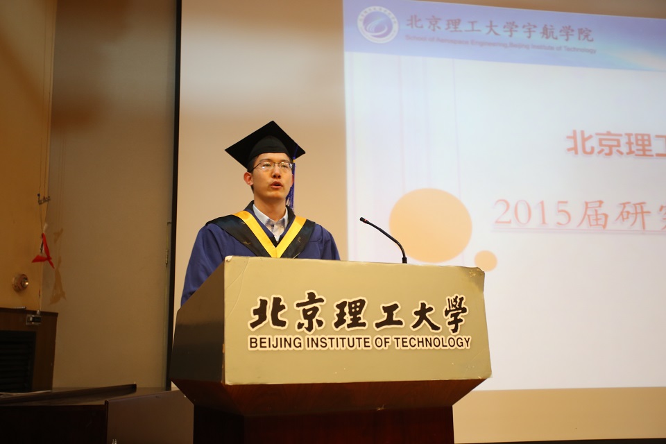 2012級碩士生陳喆代表全體畢業生發言,他深情地回顧了在北京理工大學學習和生活的點滴,致敬在理工的每一滴汗水,回味聚在一起的每一個瞬間,懷念朝夕相處的那一段光陰流年,表達了對母校、對老師、對同學的感恩和不舍。