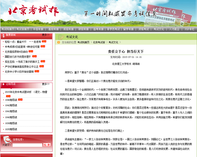 原文鏈接:【人民網】北理工校長給畢業生的叮囑:責任立于心 擔當行天下