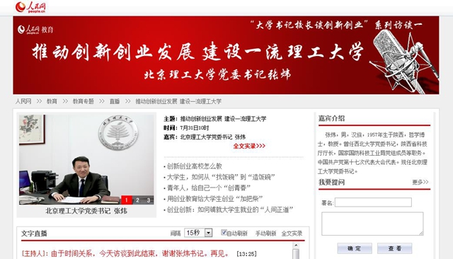 北理工黨委書記張煒做客人民網:推動創新創業發展 建設一流理工大學