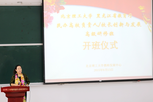 2015年9月13日上午,北京理工大學教師發展中心與黑龍江省教育廳聯合舉辦的黑龍江省民辦高校負責人/校長高級研修班在北京理工大學中心教學樓407教室舉行了開班儀式。此次研修班旨在提升校長的領導力、執行力和組織協調能力,拓展校長的辦學思路,推進民辦教育的改革和創新。北京理工大學黨委書記張煒、黑龍江省教育廳政策法規處處長李智育、北京理工大學人事處處長韓寶玲、北京理工大學教育研究院書記龐海芍、教育研究院院長何海燕出席了開班儀式。研修班全體學員參加了開班儀式。