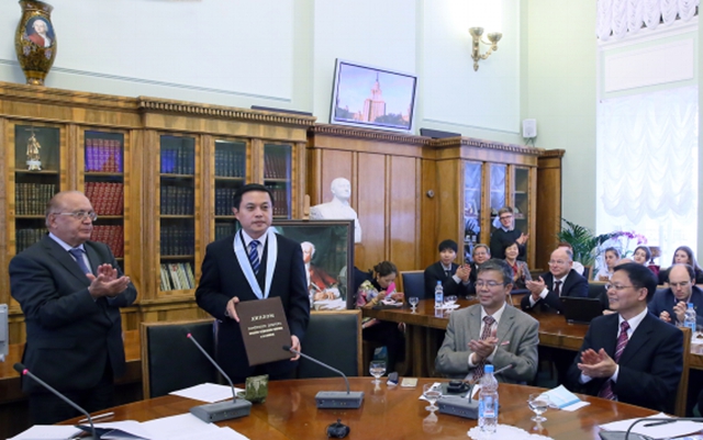 Sadovnichy校長為胡海巖校長授予莫斯科大學名譽博士學位證書和勛章
