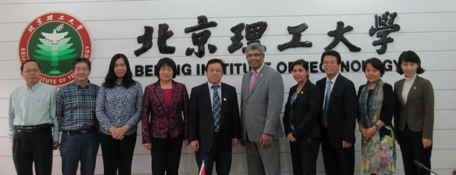2015年10月14日下午,加拿大卡爾加里大學(University of Calgary)國際事務副教務長Janaka Ruwanpura、國際事務主管Savera Hayat-Dade及加拿大艾伯塔省政府中國辦事處教育官員羅亞杰一行三人訪問北京理工大學,楊賓常務副校長在2號樓133會議室會見了來賓。