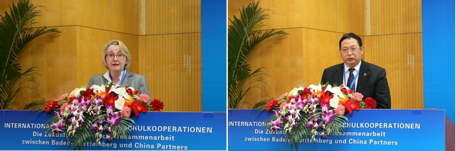 Theresia Bauer部長在致辭中闡述了中德高等教育領域合作的重要意義,高度評價巴符州高校與中國伙伴學校的合作。她相信,高等教育國際化是時代的要求,學生交換、教師交流和科技合作不僅推動了高校的國際化,也對區域發展和全球經濟做出了積極的貢獻。Bauer部長表示,巴登符騰堡州科學、研究及藝術部將采取積極措施,支持大學校長之間、學者之間分享多樣化的合作經驗、謀劃共同的國際化發展道路,為巴符州高校與中國伙伴學校建立內容更加豐富的合作提供服務。楊曉春處長概述了中德教育交流合作所取得的豐富成果,高度評價本次論壇在豐富中德高校合作方面的重要意義,期望雙方高校為加強兩國高層人才培養、創新發展、產業轉型以及廣泛的人文交流的合作積極作為,為服務兩國關系發展、匯聚兩國民眾智慧做出新的貢獻。