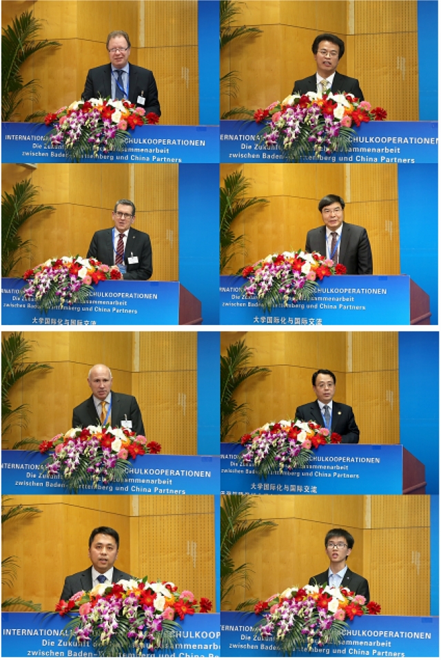 研討會上,斯圖加特大學校長Ressel教授、北理工國際處處長唐水源教授、巴符騰堡州州立雙元制大學總校長Geilsdorfer教授、對外經濟貿易大學副校長趙忠秀教授、曼海姆應用科技大學校長Leonhard教授、卓越聯盟高校代表西北工業大學國際處副處長張文濤先生作專題報告,分別闡述了中德高校合作的戰略選擇、學位項目、聯合研究與伙伴關系展望。北理工-卡爾斯魯厄理工大學校友牛霈先生、北理工-斯圖加特大學校友王奕涵先生作為留德學生代表發言。