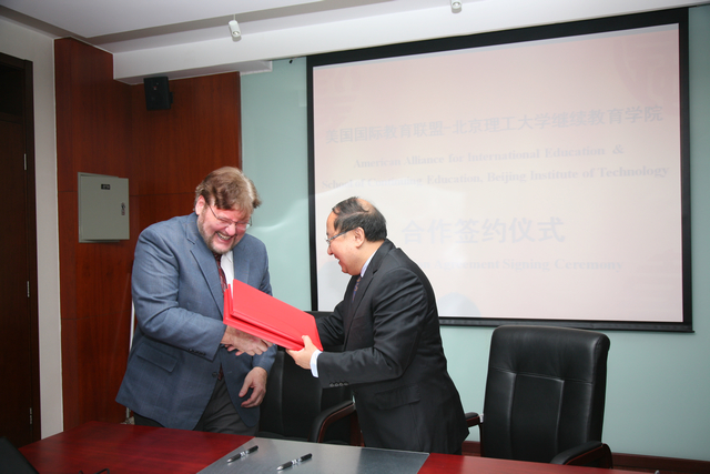2015年11月10日上午,北京理工大學繼續教育學院與美國國際教育聯盟(簡稱AAFIE)合作簽約儀式在我校繼續教育樓418會議室舉行。合作協議主要內容為:北京理工大學與AAFIE合作建立“北京理工大學-美國國際教育聯盟國際工程師教育培訓中心”,開展國際工程師教育與培訓合作。此項合作是我校繼續教育學院在楊樹興副校長的領導下,在國際交流合作處的指導下進行的。