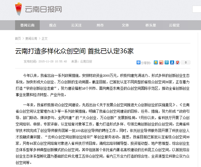 據(jù)《云南日?qǐng)?bào)》訊,在云南省近日舉行的“云南省眾創(chuàng)空間授牌暨雙創(chuàng)工作推進(jìn)會(huì)”上,經(jīng)省科技廳認(rèn)定,云科北理工五華等36家單位成為首批省級(jí)眾創(chuàng)空間。云南省通過(guò)搭建一批創(chuàng)業(yè)服務(wù)平臺(tái),真正實(shí)現(xiàn)創(chuàng)新創(chuàng)業(yè)資源的整合與聚集。