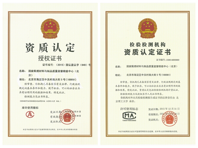 2015年12月31日國家認證認可監督管理委員會“國認實函【2015】132號”批復給予依托北京理工大學建設的“國家阻燃材料與制品質量監督檢驗中心”授權,授權證書編號“【2015】國認監認字(649)號”,授權“國家阻燃材料與制品質量監督檢驗中心”在國家質檢總局、國家認監委的監督和指導下,在授權的范圍內,開展產品的質量監督檢驗業務。該中心是目前我國阻燃材料與制品行業唯一的國家級質檢中心。北京理工大學也因此成為獲國家認監委授權的三所高校之一。