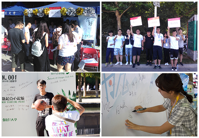 為確保迎新工作有條不紊進行,設計學院提前對高年級迎新志愿者進行了相關培訓。迎新志愿者于清晨五點就來到迎新現場,完成迎新站的布置等前期準備工作。六時許,新生陸續到達迎新站完成注冊流程,并在棚后的噴繪墻上簽名并拍“四年照”留念,為每位新生記錄下這一美好的回憶。