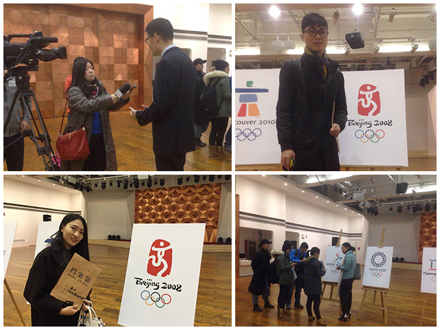 辦公室外的展廳里布置了歷年奧運會的會徽主題展覽,伴隨著2008年奧運會《我和你》的歌聲,仿佛又將同學們帶回了那場無與倫比的奧運盛事之中。在完成現場投稿后,北理工設計學院的黃奕搏和康丹同學一起接受了中央電視臺的采訪,他們分別介紹了自己作品的靈感來源及參加活動的感想。