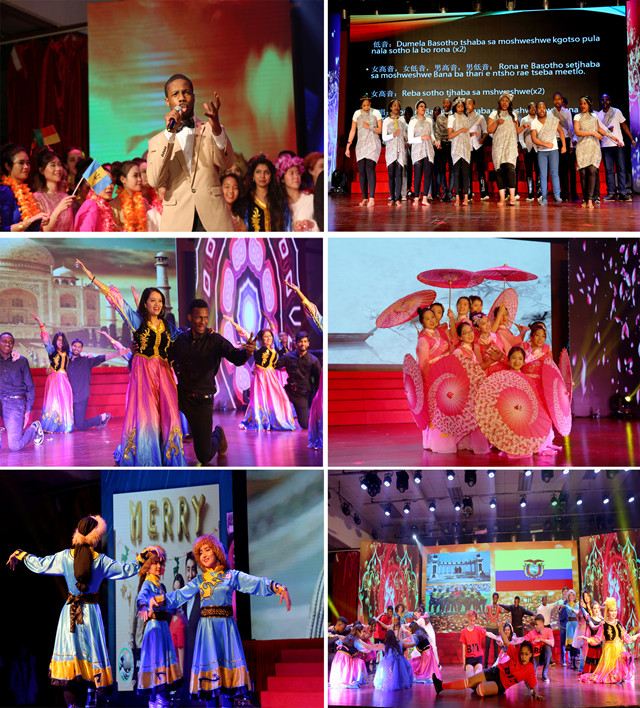 頒獎典禮結(jié)束后,北京理工大學2017“一帶一路”留學北理聯(lián)歡會正式開始,從中國出發(fā),沿絲綢之路,再回到中國,展現(xiàn)了北理工留學生的才藝特長和豐富多彩的精神生活。北理工每學期為留學生開設功夫選修課,留學生武術(shù)隊的功夫表演震撼全場,弘揚了中華文化;來自中亞、西亞、歐洲的舞蹈向我們展現(xiàn)了曼妙多姿的異域風情;南非學生的大合唱和膠靴舞則向我們展現(xiàn)了狂野的非洲文化,他們是我校第一批由南非自由州政府選拔的優(yōu)秀獎學金生,表現(xiàn)優(yōu)異;南亞印度舞奔放熱情,老撾舞蹈優(yōu)雅婉約,傳統(tǒng)的鼓聲仿佛把我們帶到了美麗的東南亞;當我們跟著絲綢之路的腳步再次回到中國,則是留學生中心老師們的江南舞,她們優(yōu)美的舞姿贏得了學生的陣陣喝彩;來自德國、波蘭、尼日利亞等18個國家學生表演的歌舞《闔家歡》將晚會推向高潮,同學們更是在舞臺上擺出了BIT的隊形,以表達他們對北理工的熱愛。