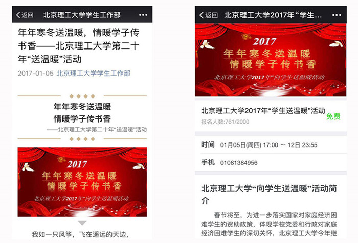 春節臨近,為進一步落實國家對家庭經濟困難學生的資助政策,體現學校黨委和行政機關對家庭經濟困難學生的深切關懷,北理工今年繼續開展“向學生送溫暖”活動。截至2017年,北理工已開展春節“向學生送溫暖”活動二十次,今年“向學生送溫暖”活動通過給家庭經濟困難學生路費補助和發放讀書卡,來保障同學們能夠帶著學校的慰問和關心順利回家過年。活動的資助對象為家庭貧困的本科生,并向家庭經濟困難2016級新生和家庭經濟困難程度高的學生傾斜。