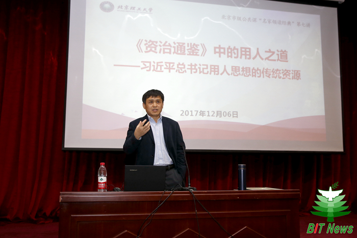 編輯:郭強 審核:李德煌 閱讀次數:2017年12月6日,由北京市教工委主辦、北京理工大學馬克思主義學院承辦的“名家領讀經典”北京市級高校思想政治理論課第七講在我校中關村校區中教報告廳舉行。中國人民大學歷史學院黨委書記劉后濱教授受邀來我校授課,課程的主題是《<資治通鑒>中的用人之道——探尋習近平總書記選人用人思想的傳統資源》,課程由北京理工大學馬克思主義學院副院長郭麗萍教授主持。來自中國人民大學、北京航空航天大學、北京化工大學、北京中醫藥大學、北京信息科技大學、北京聯合大學等多所高校的學生及北京理工大學各院系師生代表共計500余人參加了此次課程。