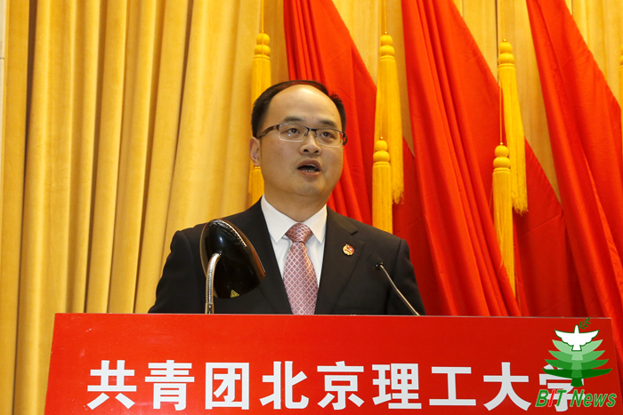 熊卓代表共青團北京市委講話。他表示,近年來,北京理工大學各級共青團組織在學校黨委的堅強領導下,立足學校教育教學工作和首都經濟社會發展大局,理想信念教育取得顯著成效,組織建設活力不斷增強,校園文化建設繁榮發展,成長服務領域不斷拓寬,品牌活動影響力不斷提高,為青年學生的成長成才搭建了廣闊舞臺,為首都高校共青團事業發展做出了積極的貢獻。他代表共青團北京市委對北理工各級共青團組織和團員青年提出了三點希望:一是認真學習貫徹黨的十九大精神,切實加強對廣大團員青年的思想政治引領;二是堅持以圍繞中心、服務大局為主線,積極為建設一流的和諧宜居之都做貢獻;三是順應時代發展和青年工作新特點,進一步推進共青團改革。