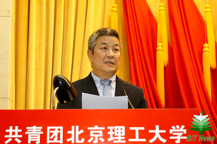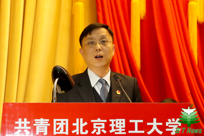 李驥代表共青團中央講話。他表示,北京理工大學是中國共產黨創辦的第一所理工科大學,七十多年來,北京理工大學各級團組織緊緊圍繞學校中心工作和青年發展需要,充分發揮自身優勢,切實履行基本職能,取得顯著的成績。他對北理工共青團務實扎實的工作作風、極具特色的品牌活動、涵蓋全面的工作理念、大膽創新的工作形式、蓬勃向上的青年精神狀態表示了充分肯定。他指出,新形勢新挑戰下,共青團承擔著團結青年一代的神圣使命和重大責任。他表示,希望共青團組織抓住機遇、砥礪前行,將學習宣傳貫徹黨的十九大精神作為當前和今后一個時期的首要政治任務,發揮好共青團在“大思政”格局中生力軍的作用,同時要著力推動團學改革攻堅,抓緊抓實從嚴治團,培養廣大團員青年成為新時代合格的社會主義接班人。