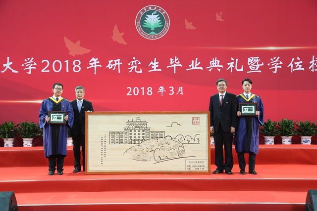 機械與車輛學院畢業生用機械制圖的繪圖板和金工實習的電烙鐵制作了一幅木板烙畫“烙印北理新時代”獻禮母校。作品以學校自主研發的99A坦克、奧運電動汽車等特色車種為元素組合成一輛向前行駛的車輛,寓意學校承載著這些成果不斷向前奮進,走進新時代,蘊含著畢業生對母校的繾綣深情和美好祝愿。趙長祿、張軍代表學校接受了贈送,并向畢業生贈送由校友卡和紀念書簽組成的畢業紀念品。