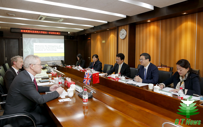 編輯:郭強 審核:唐水源 閱讀次數:4月16日下午,英國布里斯托大學(University of Bristol)代表團一行5人訪問北京理工大學,校長張軍院士在良鄉校區會見Hugh Brady校長一行。