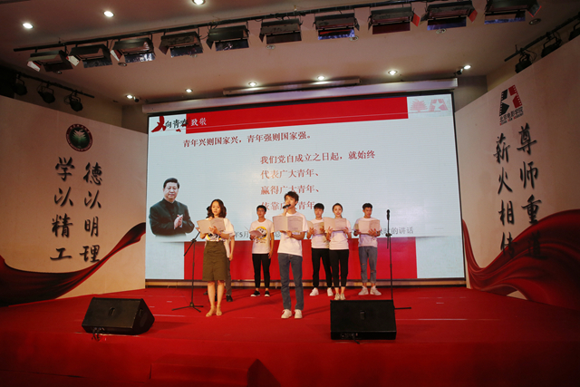 在北理工團(tuán)員代表劉楠彬和北影團(tuán)員代表王俊凱領(lǐng)誦下,全場(chǎng)青年團(tuán)員共同朗誦了“習(xí)近平總書記寄語青春語錄”,表達(dá)了兩校青年學(xué)子不忘總書記囑托,爭(zhēng)做擔(dān)當(dāng)民族復(fù)興大任的時(shí)代新人的心聲。