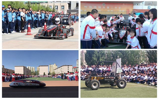 5月2日至5日,在五四青年節到來之際,北京理工大學機械與車輛學院青年大學生科技創新作品成功走進內蒙古自治區6所重點高中:呼和浩特市第二中學、內蒙古師范大學附屬中學、呼和浩特市第一中學、北重三中、包頭市第九中學、包鋼一中,為青年高中生們帶來了大學生科技創新的盛宴,使得6所學校的萬余名高中生近距離感受了大學生的創造力和想象力,親身體會了科學的奧秘。學院黨委書記左正興、常務副院長胡紀濱、副書記副院長范文輝,北理領航人王文中、左哲、陳亞琴、梁鶴、管繼富、李雪原以及學院招生宣傳工作組老師、各賽車隊青年大學生代表等共計18人,分別在對應的高中舉行了覆蓋三個年級的專題學術講座以及招生宣傳咨詢會,使得高中生們對北京理工大學在人才培養、科學研究、國際交流、社會服務等各個方面有了更深的認識和了解,對于吸引更多的優秀生源報考我校起到了積極促進的作用。