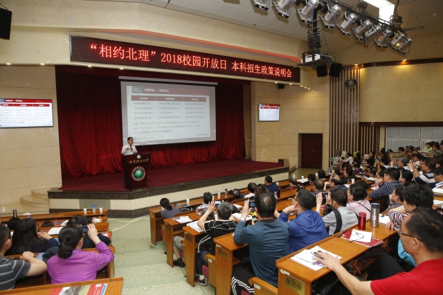 上午10時,北京理工大學2018年本科招生政策說明會在中心教學樓一層報告廳舉行,現場座無虛席。今年本科招生政策說明會首次采用網絡直播形式,使得更多考生和家長同步掌握第一手新鮮資訊。招生就業工作處副處長張東從主要圍繞我校育人目標、學科實力、專業特色、學生科創、國際交流、就業質量、留學深造和2018年最新招生政策等進行了全方位情況介紹。現場氣氛活躍,考生和家長認真聆聽,嚴謹而又生動的講座令現場不時迸發出陣陣掌聲。