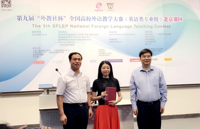編輯:卞廣為 審核:張萊湘 閱讀次數:6月9日至10日,第九屆“外教社杯”全國高校外語教學大賽北京賽區的復賽及決賽在對外經貿大學舉行。本次比賽分為英語專業組和商務英語組,來自北京市40余所高校的50余名優秀教師參加角逐。北京理工大學外國語學院選派了曾在今年4月學院青年教師教學基本功比賽中教學演示環節榮獲一等獎的青年教師劉露,代表北京理工大學參加英語專業組的比賽。在為期兩天緊張而激烈的賽程中,劉露老師以優美流暢的語音語調和邏輯嚴謹的課堂設計,在復賽的講課環節和決賽的說課環節脫穎而出,最終斬獲英語專業組特等獎,即將代表北京賽區參加11月的全國決賽。