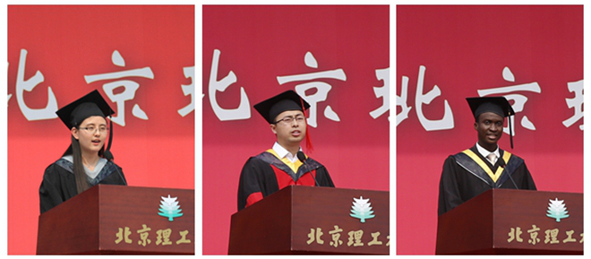 化學與化工學院2018屆本科生陳凡、宇航學院2018屆博士研究生魏昕林、計算機學院2018屆本科生尼日利亞籍留學生阿米努3名同學代表全體畢業生感恩母校和老師們的悉心培育。他們分享了自己在北理工的學習生涯,特別是與老師和同學們一起潛心求知、大膽創新、勤于實踐的難忘經歷和豐碩成果,回顧了北理工“團結、勤奮、求實、創新”的優良校風和“實事求是、不自以為是”的嚴謹學風對自己求學、擇業和人生發展的深刻影響,代表畢業生表達了對母校的感謝和祝福,并向母校作出承諾,將繼承北理人的使命和榮光,擔復興大任,做時代新人,努力成長為“胸懷壯志、明德精工、創新包容、時代擔當”的領軍領導人才。
