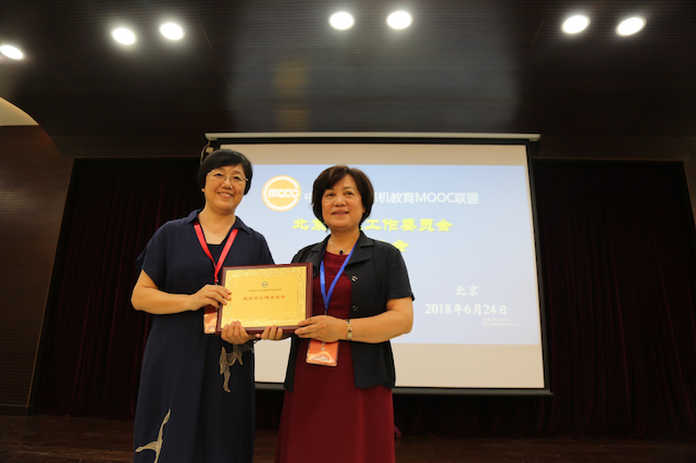 中國高校計算機教育MOOC聯(lián)盟副秘書長、清華大學劉強教授代表聯(lián)盟向北京市工作委員會授牌,北京市工作委員會主任、北京理工大學李鳳霞教授代表工委接受了聯(lián)盟授牌。李鳳霞教授介紹了北京市工作委員會的情況和下一步的工作計劃。