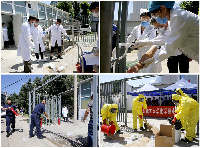 演練分四個階段:第一階段,中轉室正常運行期間發生硫酸泄露傷人事故,中轉室管理員組織進行了初期急救、疏散;第二階段,校醫院接到中轉室報告后,派醫務人員趕赴現場進一步救治傷者;第三階段,遺撒在地上的硫酸、有機廢液起火,中轉室管理員使用滅火器進行了前期撲救;第四階段,保衛處、環保技術公司接到中轉室報告后,趕赴現場分別進行警戒、滅火及泄漏物后期清理。最終,警報解除,演習結束。
