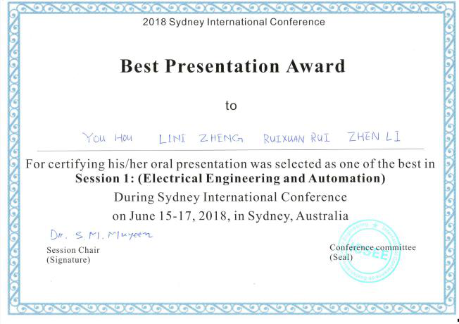 ICSEE2018由澳洲八校聯(lián)盟、新西蘭奧克蘭大學(xué)聯(lián)合主辦,是面向新能源電力系統(tǒng)領(lǐng)域的頂級學(xué)術(shù)會議之一,同時(shí)也是澳大利亞電力系統(tǒng)領(lǐng)域?qū)W術(shù)年會,此次大會共錄用120篇論文,其中15篇推薦發(fā)表至《International Journal of Smart Grid and Clean Energy》期刊(包括獲獎?wù)撐模4髸鶕?jù)匿名通訊評審結(jié)果,從錄用的120篇論文中評選20篇進(jìn)入嚴(yán)格的現(xiàn)場答辯環(huán)節(jié),來自澳洲新南威爾士大學(xué)IEEE Fellow Joe Dong教授、新西蘭奧克蘭大學(xué)IEEE Fellow Udaya K. Madawala教授等評委對該項(xiàng)研究表示了高度評價(jià)、充分肯定和鼓勵,最終本論文因其在逆變器孤島運(yùn)行不平衡工況下自適應(yīng)虛擬阻抗控制方面的貢獻(xiàn)而獲得最佳論文獎。這是理工學(xué)子首次在電氣工程領(lǐng)域的國際會議中獲最佳論文獎項(xiàng)。